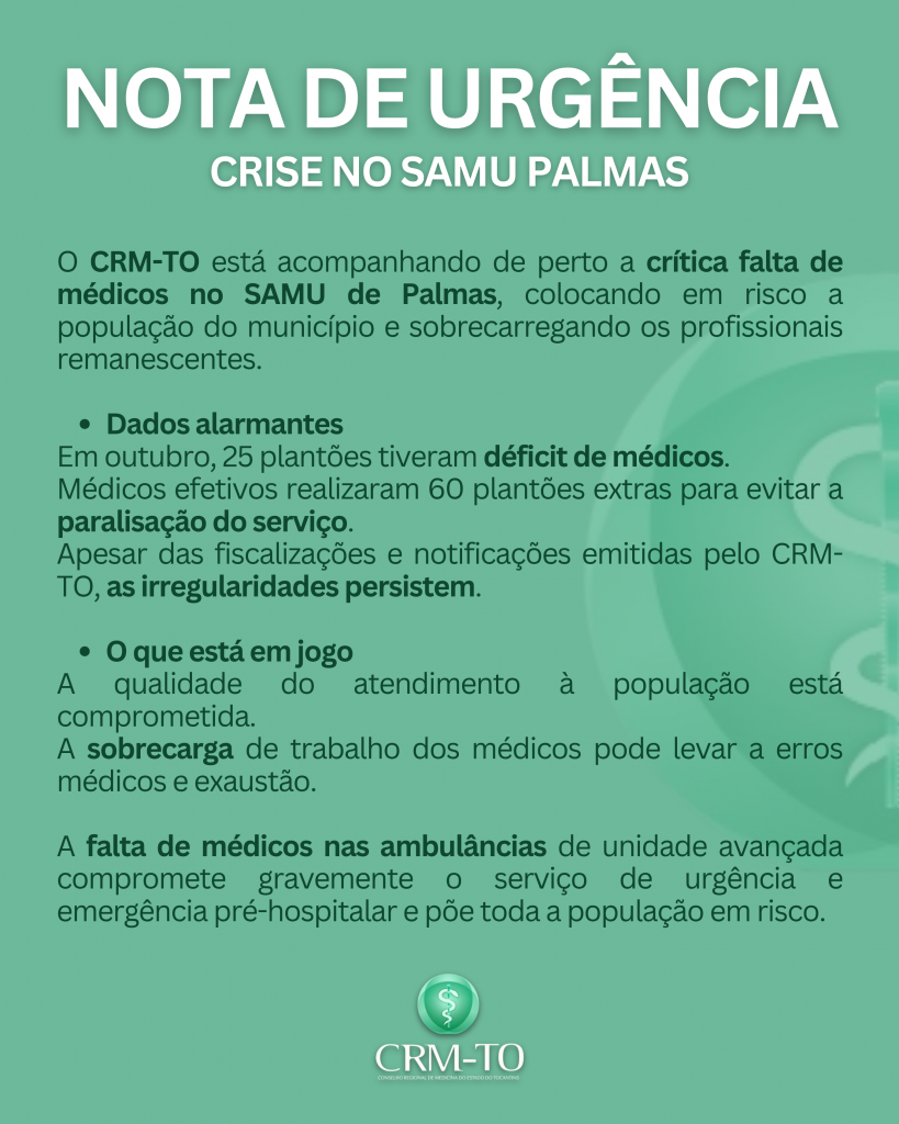 O CRM-TO está acompanhando de perto a crítica falta de médicos no SAMU de Palmas, colocando em risco a população do município e sobrecarregando os profissionais remanescentes.