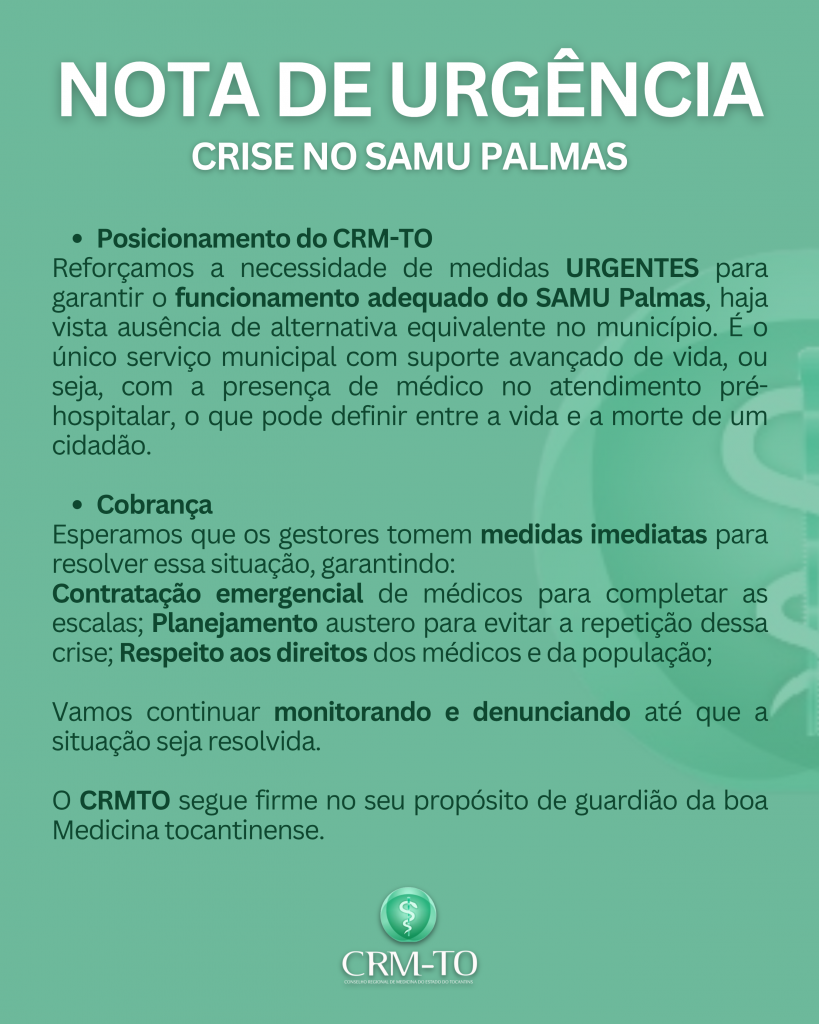 Reforçamos a necessidade de medidas URGENTES para garantir o funcionamento adequado do SAMU Palmas, haja vista ausência de alternativa equivalente no município. É o único serviço municipal com suporte avançado de vida, ou seja, com a presença de médico no atendimento pré-hospitalar, o que pode definir entre a vida e a morte de um cidadão.